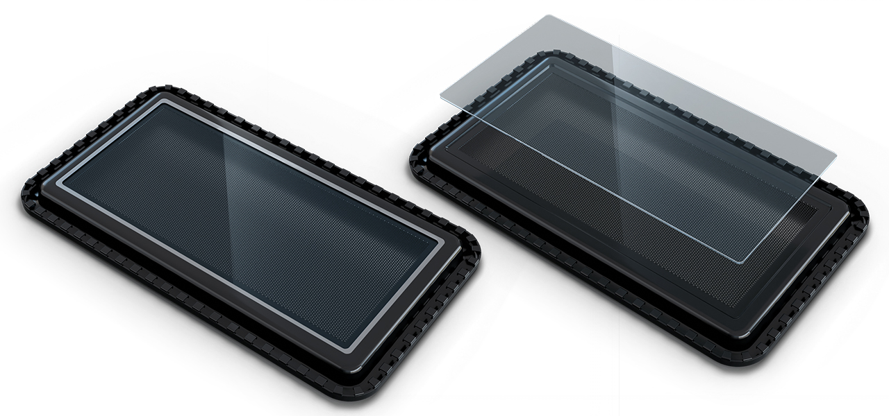 In microwaves, the glass door is both a design and functional element. Brackets are bonded to the glass door inside with a structural adhesive from Henkel to attach the door frame, which holds the inner glass pane inserted there.