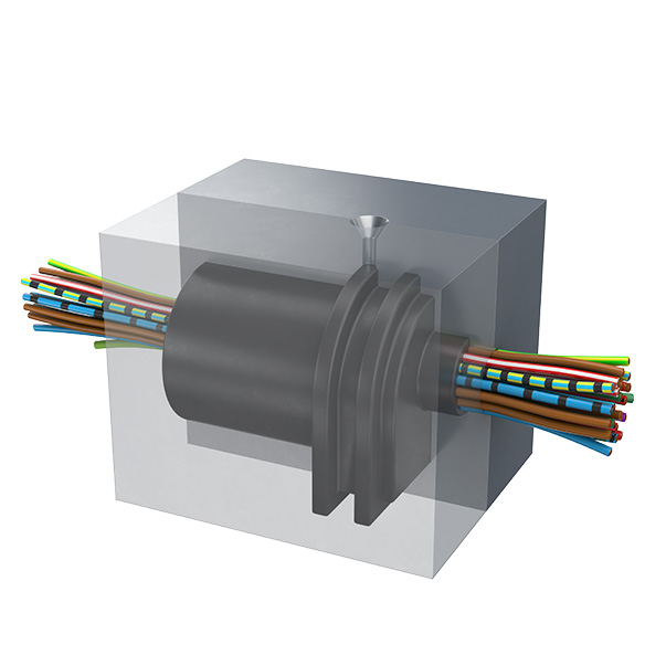 During the molding of a foam-in-place cable grommet, the material is also distributed into the spaces between the cable strands. This achieves excellent longitudinal watertightness, which prevents moisture from entering the interior from the engine compartment along the cable strands.